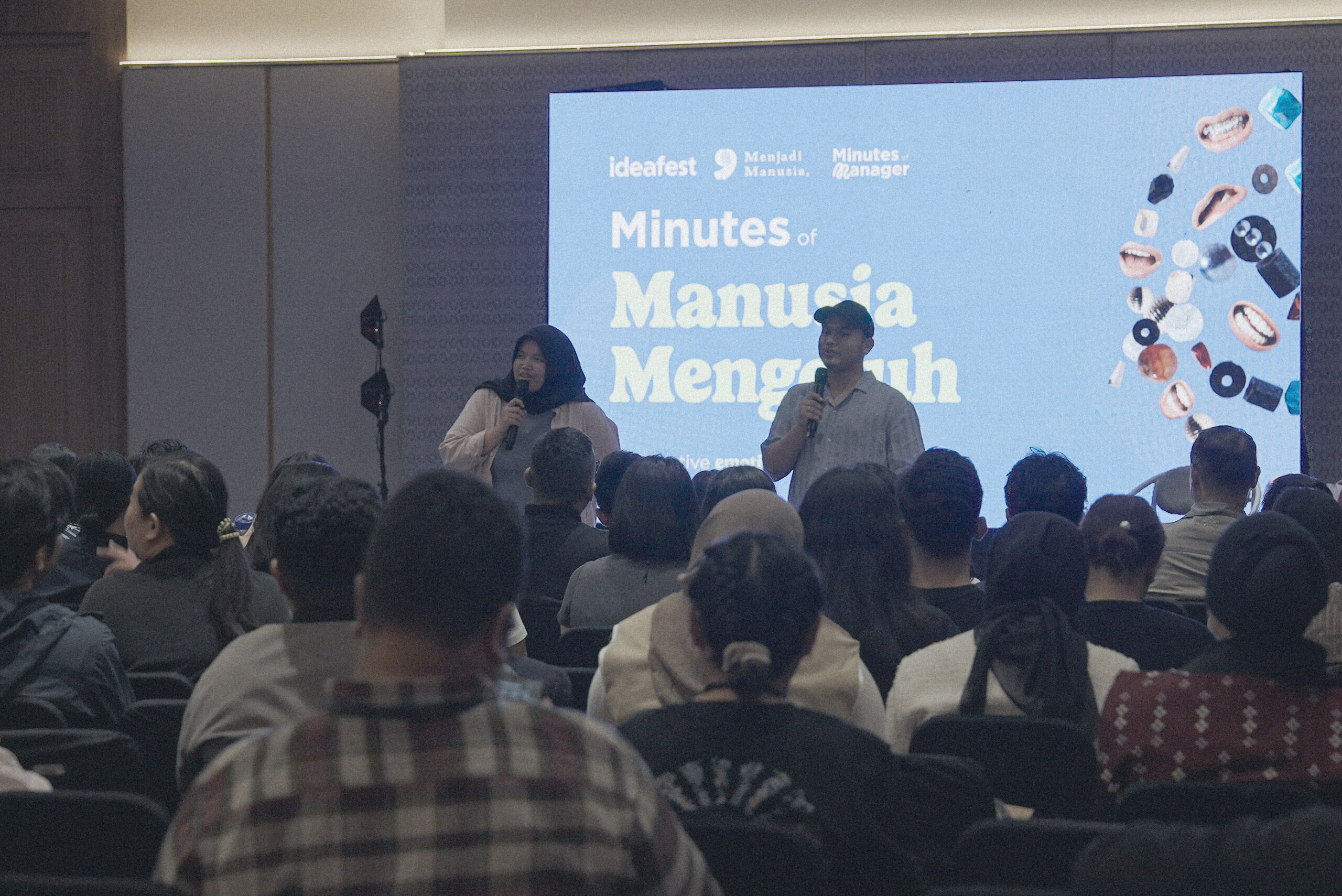 Banyak sesi yang dilaksanakan di ruangan-ruangan yang tidak terlalu besar, menciptakan suasana yang intim dan dekat. Panggung hanya sebuah podium dan hampir tidak ada jarak yang signifikan antara pembicara dengan pendengar. Interaksi yang cair juga terjadi ketika Minutes of Manager bersama Menjadi Manusia menggelar wadah “Minutes of Manusia Mengeluh”. Sesi ini mengajak para pekerja untuk berbagi cerita, meluapkan emosi, dan meditasi bersama. Yang saya lihat, di balik banyaknya jabatan pekerjaan dan tuntutan sosial darinya, manusia tetaplah manusia: pasti merasakan capek, memendam cerita, dan butuh katarsis yang sehat. Maka, 150 orang lebih yang hadir–mereka datang dari beragam industri–saling berkenalan, merangkul, dan menguatkan dalam sesi “Minutes of Manusia Mengeluh”. Ada yang bercerita dan mengeluh sembari menitikkan air mata.